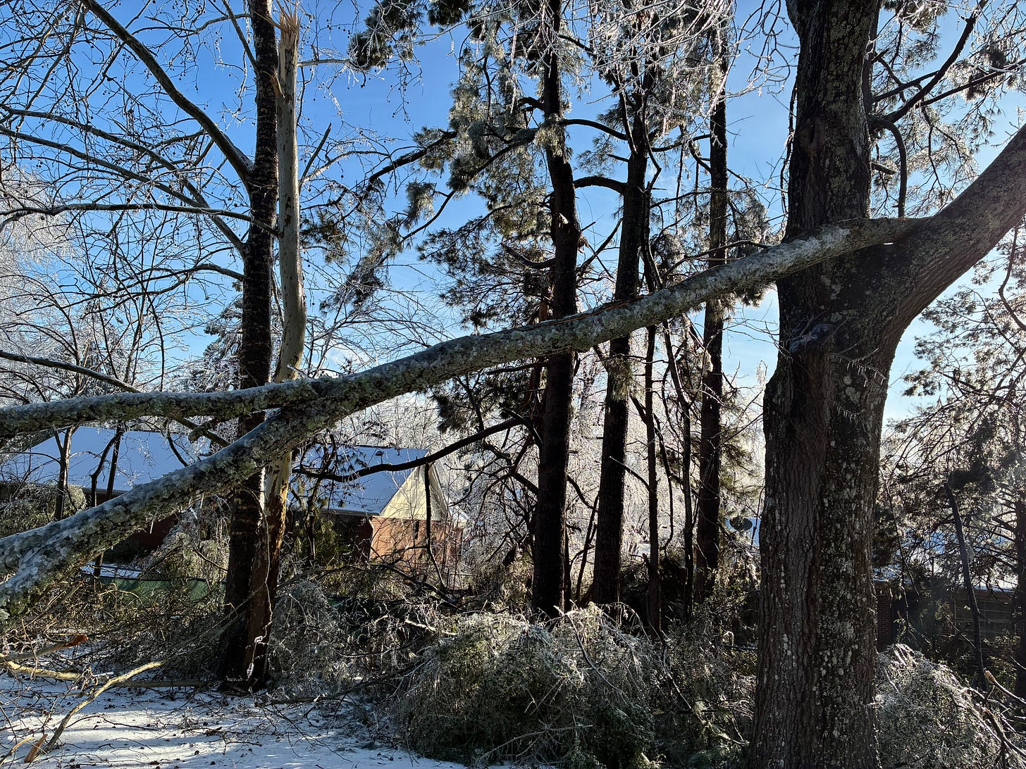 So I had myself an untoasted Maple and Brown Sugar Poptart and finally looked outside. The slap of cold warned me to the unimaginable winter wonderland of destruction and ice capade of frozen chaos. No movement other than random falling limbs out of the corner of my eye and the flashing flight of redbirds frantically flying around the shrubs that held their homes just hours earlier. It was calm and scary. And Owen was right to stay in hiding